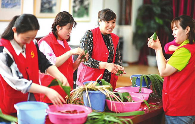 6月3日,志愿者和居民們正在開心地一邊包粽子一邊嘮家常。當(dāng)日,太原市迎澤街道青年路一社區(qū)志愿者提早備好原料,邀請社區(qū)困難家庭居民,歡聚一堂包粽子,共話美好生活。(記者李兆民攝)