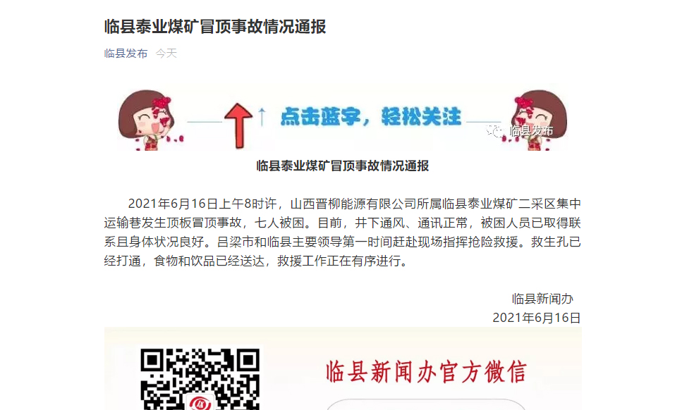 2021年6月16日上午8時許,山西晉柳能源有限公司所屬臨縣泰業(yè)煤礦二采區(qū)集中運輸巷發(fā)生頂板冒頂事故,七人被困。