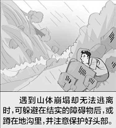 遇到山體崩塌卻無法逃離時,可躲避在結實的障礙物后,或蹲在地溝里,并注意保護好頭部。