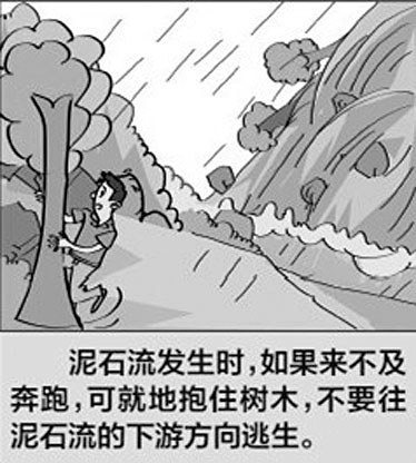 泥石流發(fā)生時,如果來不及奔跑,可就地抱住樹木,不要往泥石流的下游方向逃生。