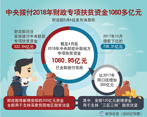 財(cái)政部4日發(fā)布消息稱,財(cái)政部近日安排撥付中央財(cái)政專項(xiàng)扶貧資金322.64億元,加上2017年10月提前下達(dá)的738.31億元,截至4月底,2018年中央財(cái)政補(bǔ)助地方專項(xiàng)扶貧資金1060.95億元已全部撥付完成,比2017年同口徑增加200億元。