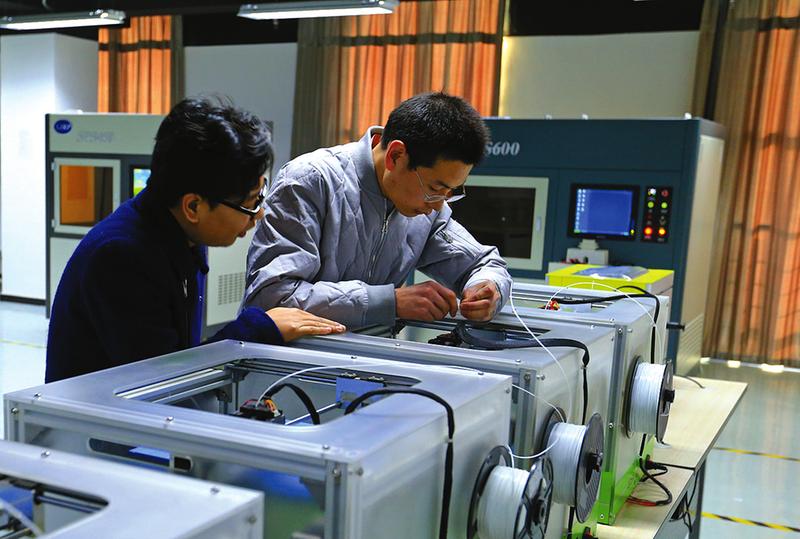 2016年12月28日,位于渭南高新區(qū)的3D打印產業(yè)培育基地內,渭南鼎信創(chuàng)新智造科技有限公司制造部李伯平(右)正利用3D打印機生產文化創(chuàng)意產品。