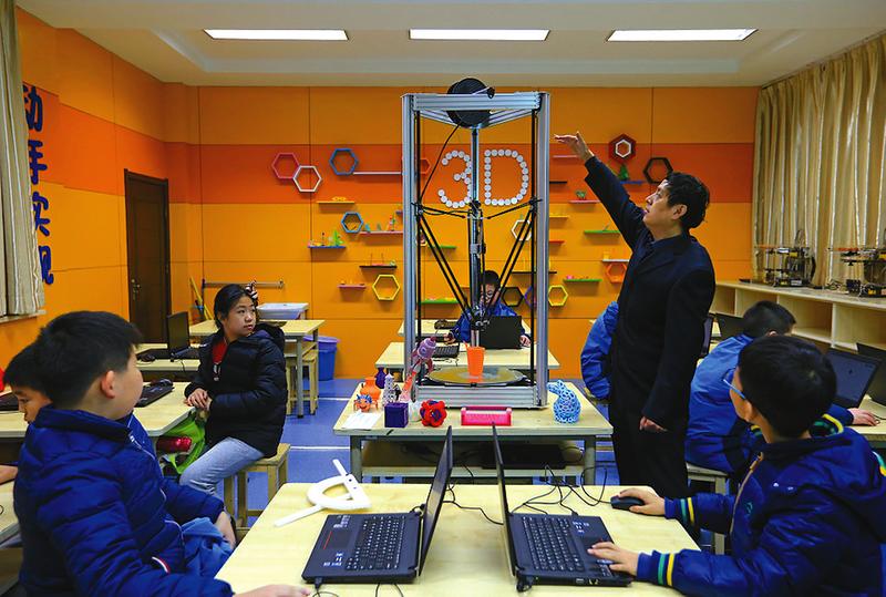 1月6日,西安交通大學附屬小學3D打印課上,趙文安老師正在為學生講解三角洲3D打印機運行原理。3D打印進入小學課堂,讓學生在課堂上高效完成創(chuàng)意構思、三維建模設計和成品打印的過程。