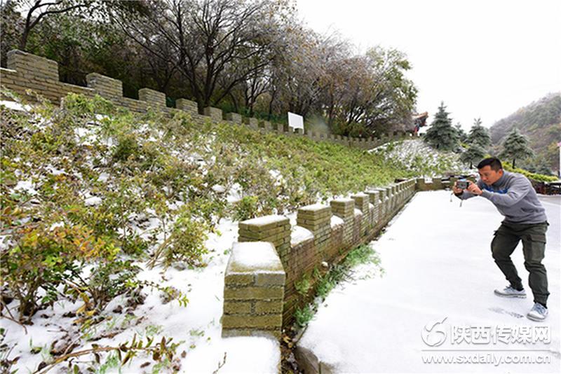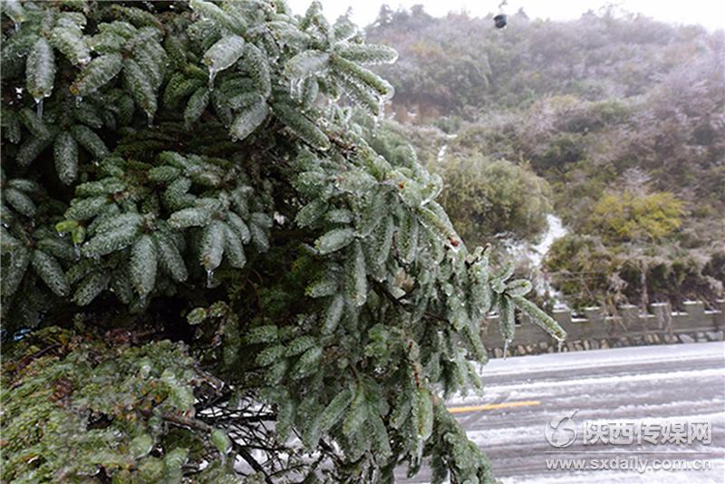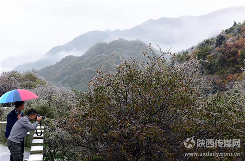 10月10日,在位于西安市長(zhǎng)安區(qū)210國(guó)道秦嶺分水嶺,急劇的降溫、持續(xù)的秋雨,不但降下一場(chǎng)雪,還使這里的樹(shù)木上出現(xiàn)晶瑩剔透的冰掛景觀,很多市民紛紛趕來(lái),目睹這一難得自然勝景。陜西日?qǐng)?bào)記者 袁景智攝 -