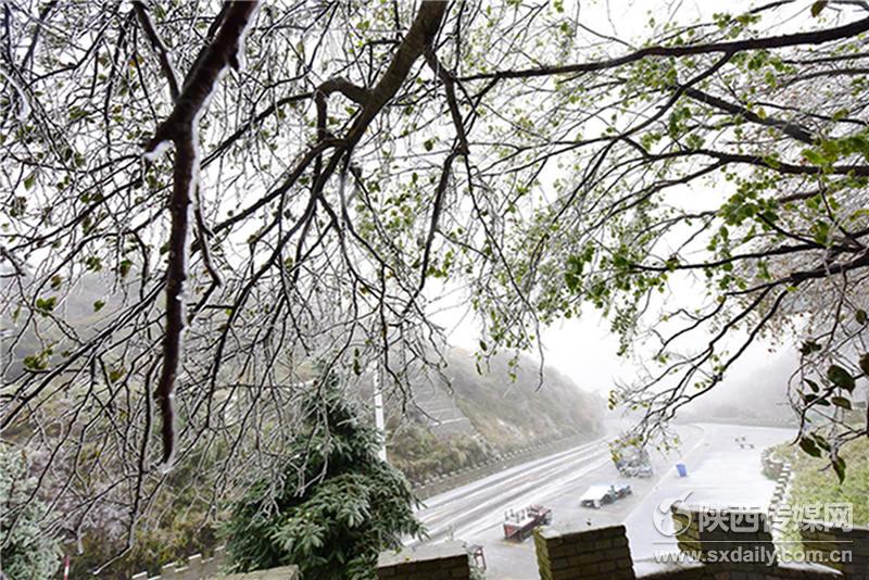 10月10日,在位于西安市長(zhǎng)安區(qū)210國(guó)道秦嶺分水嶺,急劇的降溫、持續(xù)的秋雨,不但降下一場(chǎng)雪,還使這里的樹(shù)木上出現(xiàn)晶瑩剔透的冰掛景觀,很多市民紛紛趕來(lái),目睹這一難得自然勝景。陜西日?qǐng)?bào)記者 袁景智攝