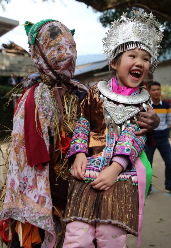 2月18日,在廣西融水苗族自治縣四榮鄉(xiāng)田頭苗寨,一名苗族小朋友(右)在參加民俗祈;顒(dòng)。