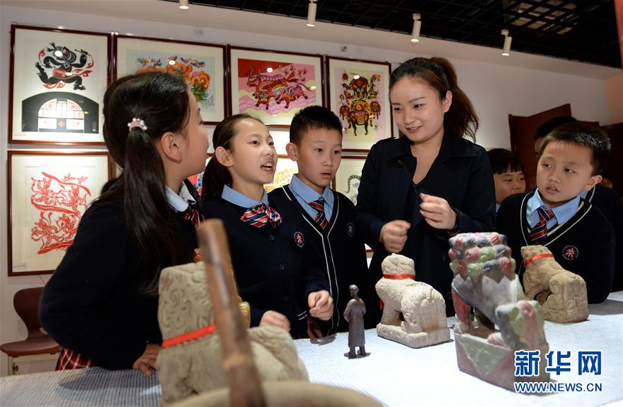 3月15日,西安市曲江第二小學(xué)學(xué)生在博物館課專職教師申珅(左四)的帶領(lǐng)下參觀學(xué)校兒童博物館。新華社記者 李一博 攝