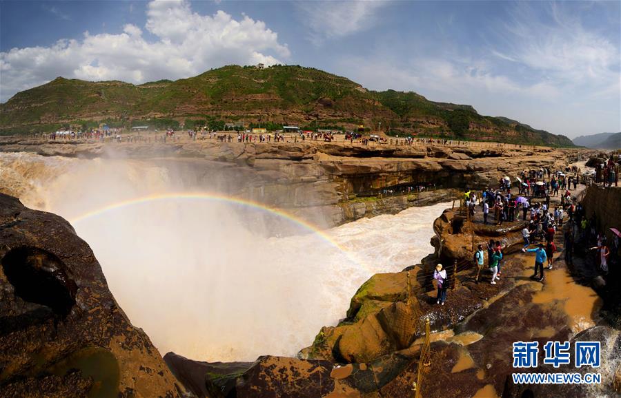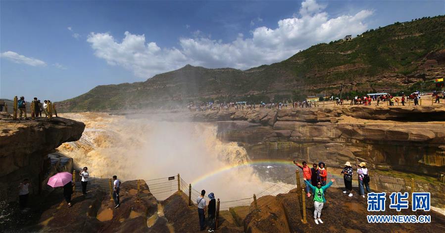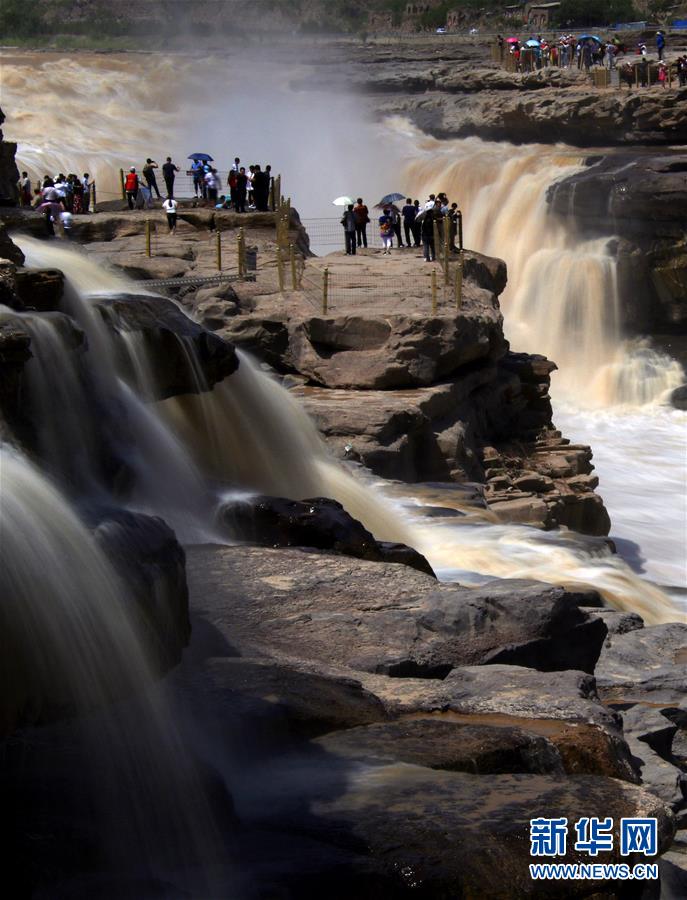 •   5月18日,游客在陜西宜川縣黃河壺口瀑布景區(qū)游覽。近日,受黃河干流降雨影響,壺口瀑布水量增加,呈現(xiàn)“大河流金”景觀,引來眾多游客參觀。 新華社發(fā)(趙潔 攝)