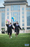 畢業(yè)生們?cè)谛iT口扔起學(xué)士帽。新華網(wǎng)發(fā) 楊思宇攝 -