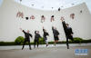 畢業(yè)生們用獨(dú)特的姿態(tài)在圖書館前留影紀(jì)念。新華網(wǎng)發(fā) 楊思宇攝 -