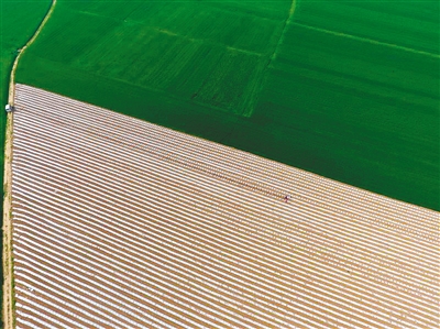西安晚報(bào)訊 (記者 黃亞平)記者昨日上午驅(qū)車來(lái)到長(zhǎng)安區(qū)砲里塬,公路兩邊的農(nóng)田里一行行,一列列西瓜地膜整齊劃一、雪白如銀,宛若徐徐打開(kāi)的一幅幅畫卷一般。