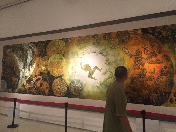 展出作品是否不都是真跡呢?記者立即前往位于曲江的西安美術(shù)館,雖然天氣炎熱,但記者發(fā)現(xiàn),來此參觀的市民還真不少,還有不少小朋友前來參觀。不少人在作品前拍照留念。投訴者李先生帶領(lǐng)記者在一、二樓展廳一轉(zhuǎn),然后,李先生告訴記者,他發(fā)現(xiàn)在二樓展出的畫作“鴻蒙初開”是一樓展出的巨幅“絲綢之路”畫作的部分節(jié)選,有高度的相似性。而李先生還講道,以他的作畫經(jīng)驗,展出的作品有不少就是仿真打印作品。而對于展出作品是否真跡,記者也隨即采訪了幾位市民,大家都表示不可能,“楊老師是大師,怎么可能作品展展示別的?”一位參觀者反問。