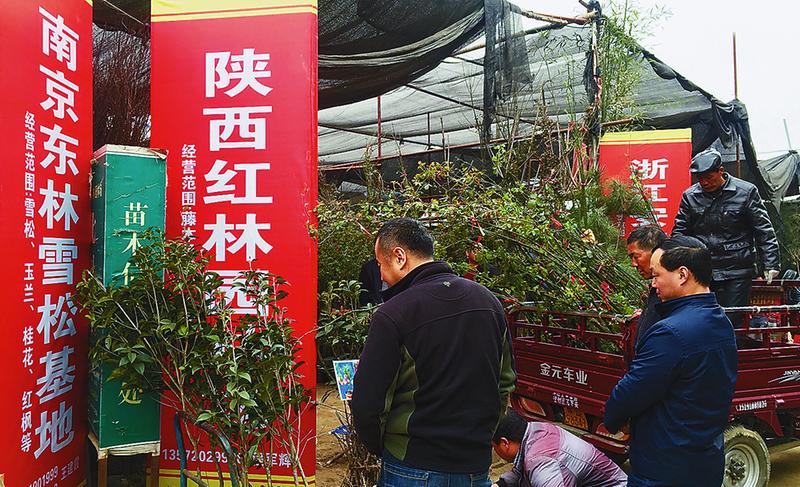 圖為客商在周至啞柏苗木花卉交易大廳大苗交易區(qū)選購苗木。