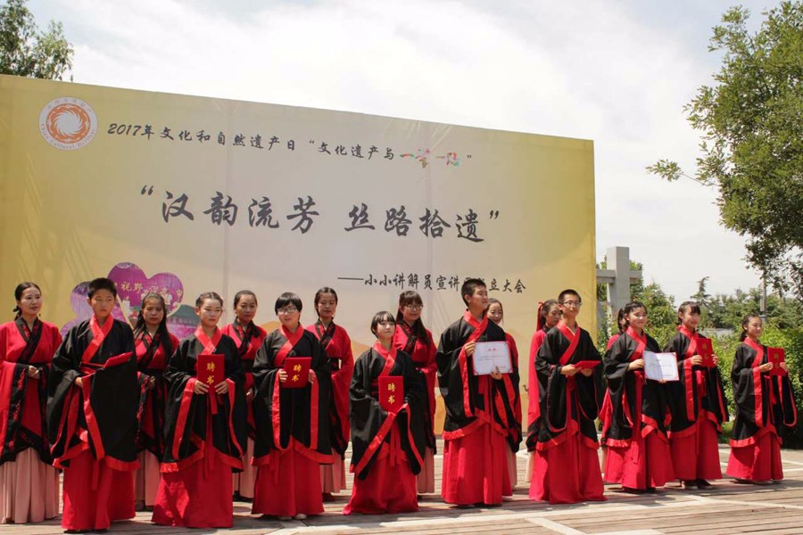 “漢韻流芳 絲路拾遺”小小講解員宣講團成立大會現(xiàn)場,來自清華大學附屬中學秦漢學校的經(jīng)過培訓和選拔脫穎而出的10名小小講解員進行了現(xiàn)場講解展示。10位小小講解員們用生動的語言結合情景劇的形式帶領觀眾走進盛世漢唐,領略絲路華彩!皾h陽陵”“漢代塑衣式女俑”“張騫”“馬踏飛燕”“鑲金獸首瑪瑙杯”“三彩釉陶載樂駱駝俑”等絲路主題講解,讓博物館里陳列的文物活靈活現(xiàn)地展現(xiàn)在觀眾眼前。經(jīng)過現(xiàn)場激烈的角逐,2名同學榮獲“絲路拾遺”最佳講解員,8名同學榮獲“絲路拾遺”優(yōu)秀講解員。漢景帝陽陵博物院將這10名學生聘為“文化遺產(chǎn)小使者”,頒發(fā)了證書。