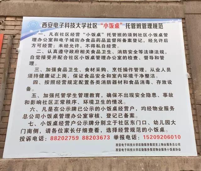 西安電子科技大學(xué)社區(qū)內(nèi)托管班招牌上附有“小飯桌登記備案戶”牌匾圖片 圖片來(lái)自大秦之聲
