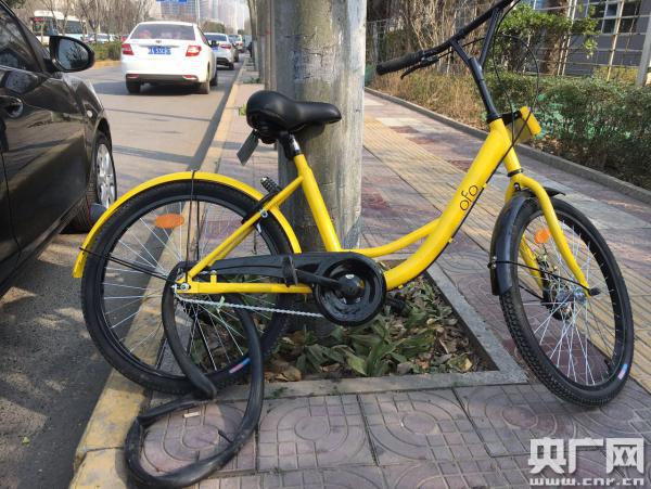 一輛車胎損壞的ofo單車被?吭谔婆d路邊的電線桿旁(圖片來自大秦之聲)