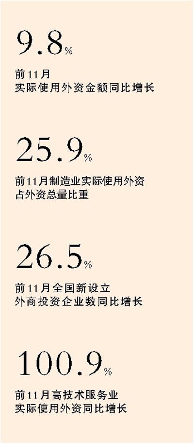 利用外資帶動(dòng)產(chǎn)業(yè)轉(zhuǎn)型升級(jí)步伐加快。前11月,制造業(yè)尤其是高技術(shù)業(yè)吸收外資延續(xù)良好增長(zhǎng)態(tài)勢(shì)。高技術(shù)制造業(yè)實(shí)際使用外資601.5億元人民幣,同比增長(zhǎng)9.9%,其中,計(jì)算機(jī)及辦公設(shè)備制造業(yè)、醫(yī)療儀器設(shè)備及儀器儀表制造業(yè)同比分別增長(zhǎng)42.7%和27.8%。高技術(shù)服務(wù)業(yè)實(shí)際使用外資1771億元人民幣,同比增長(zhǎng)100.9%,其中,信息服務(wù)、科技成果轉(zhuǎn)化服務(wù)實(shí)際使用外資同比分別增長(zhǎng)167.1%和40.5%。