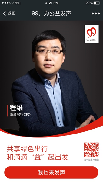 據(jù)悉,“99公益日”是由騰訊公益聯(lián)合數(shù)百家公益組織、知名企業(yè)、明星名人、愛(ài)心媒體共同發(fā)起的全民公益活動(dòng),活動(dòng)日期為每年9月7日-9月9日。今年是滴滴出行首次深度參與這一公益盛典,并成為重量級(jí)的合作企業(yè)代表。