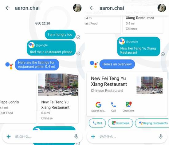 例如,當(dāng)你打算與好友約飯時,不必退出聊天軟件搜索餐廳,只需要向Google Assistant發(fā)出指令,它便會為你呈現(xiàn)附近的餐廳列表,隨意點(diǎn)擊其中一家,即可了解該店鋪的聯(lián)系方式以及地址等。除此之外,Google Assistant在搜視頻、搜圖片,以及檢索資料、地址、天氣、航班等方面也都有不錯的用戶體驗(yàn)。