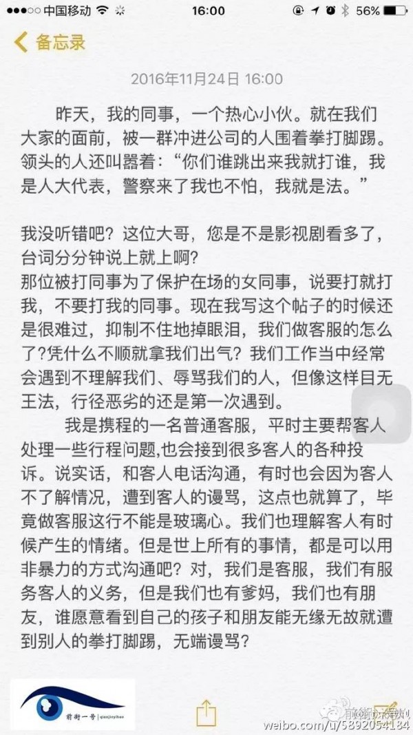 上周六,沈某帶著11個人來到攜程公司辱罵客服,稱攜程欺詐,索要退一賠一的補償,共計近11萬元。