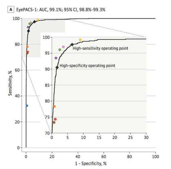 圖 2. 算法性能(黑色曲線)和八位眼科醫(yī)生(彩色圓點)在由9963個圖像組成的驗證集上判斷病變,即判斷是否存在可引起的糖尿病性視網(wǎng)膜病變(中度或更嚴重的糖尿病性視網(wǎng)膜病變或可疑的糖尿病性黃斑水腫)。圖上的黑色方塊對應(yīng)在高靈敏度和高特異性操作點中,算法的靈敏度和特異性。