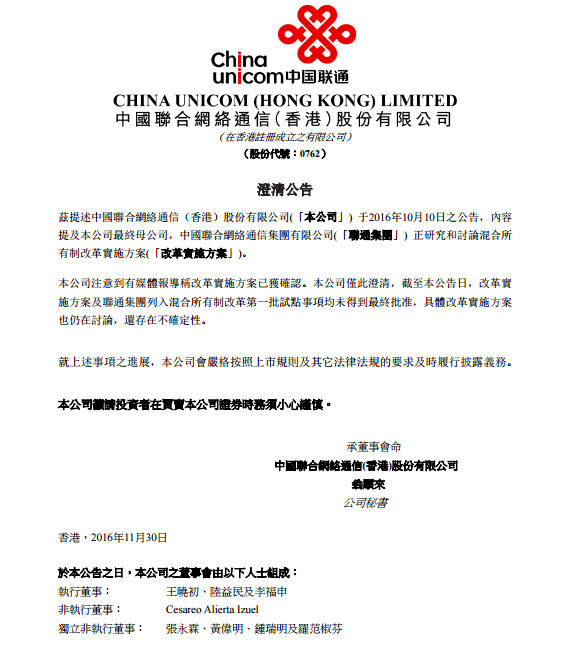 中國聯(lián)通11月30日在港交所發(fā)布澄清公告稱,混合所有制改革實施方案及聯(lián)通集團列入混合所有制改革第一批試點事項均未得到最終批準,具體改革實施方案也仍在討論,還存在不確定性。