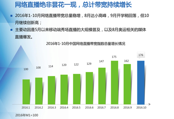 具體來看,前三季度網(wǎng)絡(luò)直播帶寬指數(shù)持續(xù)增長,以第一季度為基數(shù),二季度、三季度帶寬指數(shù)分別為116、150,呈現(xiàn)出加速上漲的態(tài)勢。從月份上來看,2016年1-10月網(wǎng)絡(luò)直播帶寬總量穩(wěn)增,8月達到小高峰,9月開學(xué)稍回落,10月繼續(xù)創(chuàng)新高。主要動因在于5月以來移動端秀場直播的大規(guī)模普及,以及8月奧運相關(guān)的媒體直播爆發(fā)。