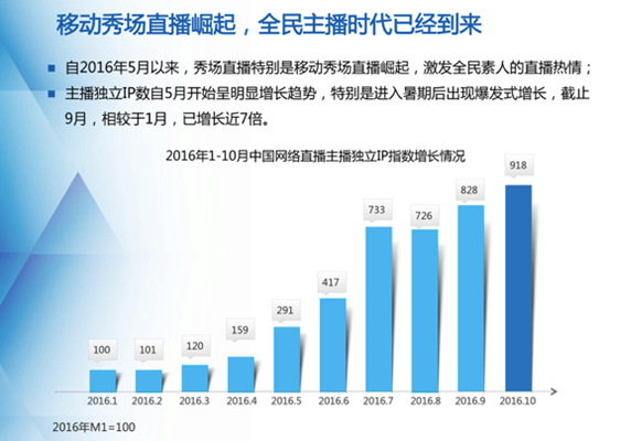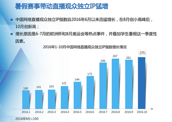 從中國網(wǎng)絡(luò)直播觀眾方面來看,觀眾獨立IP指數(shù)自2016年6月以來迅猛增長,在8月創(chuàng)小高峰后,10月創(chuàng)新高,增長原因在于6-7月的歐洲杯以及8月奧運會等熱點事件,并疊加了學(xué)生暑假這一季度性因素。