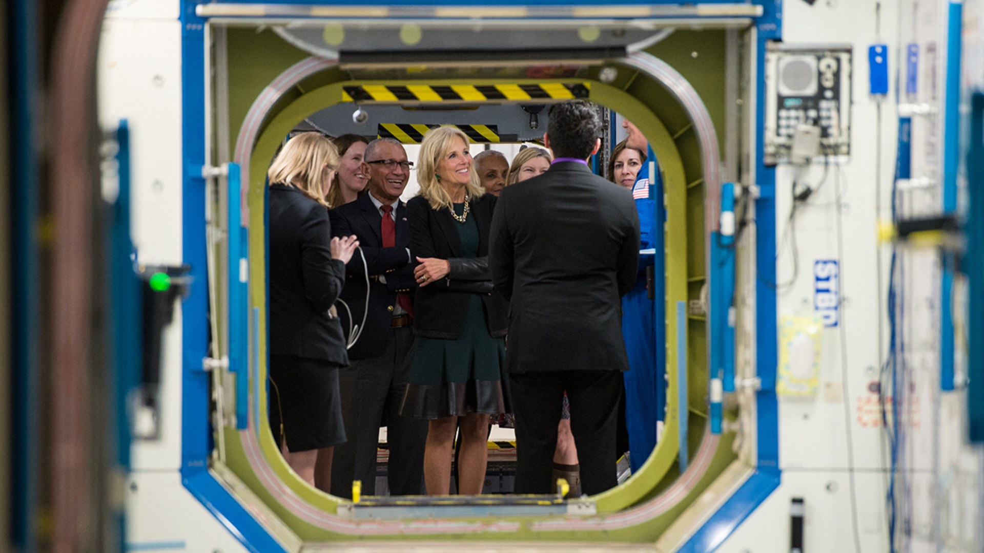 NASA管理員查爾斯 博爾登(左)、副總統(tǒng)妻子吉爾 拜登(右)于3月參觀國際空間站實(shí)體模型 -