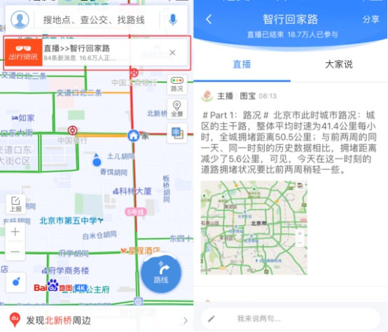 直播過程中,用戶可以很方便地進(jìn)入直播間:打開百度地圖APP,可以看到頁面最上方的“智行回家路”直播入口提醒,點(diǎn)擊后即可進(jìn)入直播間,有直播主持人“圖寶”隨時(shí)為大家更新路況信息,例如上午8點(diǎn)13分,圖寶對北京市城區(qū)路況做了及時(shí)播報(bào),信息顯示主干路整體平均時(shí)速為41.4公里每小時(shí),全城擁堵距離50.5公里等,為即將出城用戶提供最強(qiáng)參考。