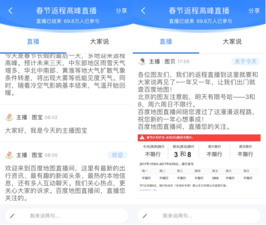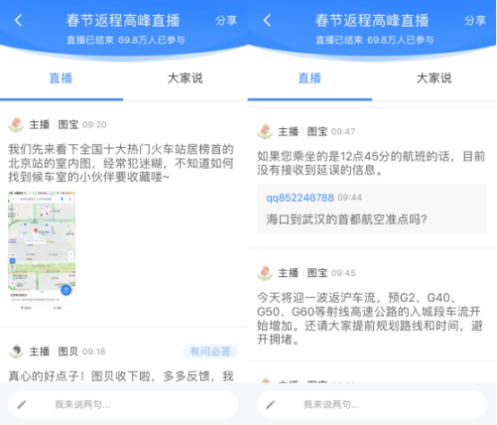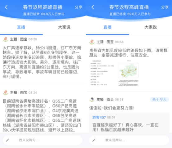 2月3日,大家迎來了節(jié)后第一個(gè)工作日。昨天——春節(jié)長(zhǎng)假最后一天,車流、客流集中返程,再加上高速免費(fèi),很多人經(jīng)歷了一場(chǎng)節(jié)后返程“大作戰(zhàn)”。為了幫助廣大用戶合理安排出行計(jì)劃順利返程,2月2日早上8點(diǎn),百度地圖及時(shí)上線“返程交通直播”:直播開啟第一個(gè)小時(shí)內(nèi),就有累計(jì)20萬人涌入直播間參與互動(dòng),刷新直播間記錄;直播一直持續(xù)到下午6點(diǎn),長(zhǎng)達(dá)10個(gè)小時(shí),總參與人數(shù)達(dá)到69.8萬。