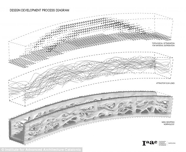 加泰羅尼亞高等建筑研究院負責整座橋的設計,設計團隊負責人 Areti Markopoulou表示:“傳統(tǒng)建筑建造過程不可避免地存在大量材料浪費,但3D打印技術可以控制材料的使用。” “通常情況下,我們受制于簡單的建筑幾何圖形,因為制造復雜的模具十分復雜費錢! “但在建造這座橋時,我們能用復雜但似乎自然天成的模具進行實驗,并且能夠設計出用傳統(tǒng)方式無法完成的建筑圖形!