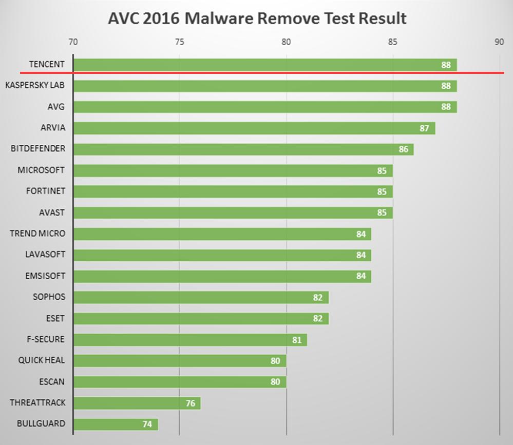 同時,值得一提的是,清除測試系騰訊電腦管家(英文版)2016年首次參測的項目,在和卡巴斯基、AVG等國際知名殺軟的同場競技中,騰訊電腦管家(英文版)憑借自研殺毒引擎TAV,以出色的清除能力取得最高分,與卡巴斯基、AVG并列排名世界第一,榮獲“A+”最高評級。觀察清除測試結果還可以發(fā)現(xiàn),在18款參測的殺毒軟件中,騰訊電腦管家是唯一一個登榜的國產(chǎn)殺軟品牌,這代表著國產(chǎn)殺軟在惡意文件清除能力上已經(jīng)到達了世界領先水平。