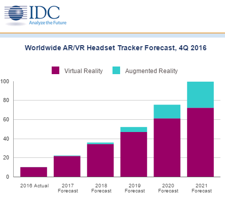 盡管當(dāng)前虛擬現(xiàn)實(shí)(VR)設(shè)備在收入方面占據(jù)市場(chǎng)主導(dǎo)地位,但I(xiàn)DC認(rèn)為未來(lái)增強(qiáng)現(xiàn)實(shí)(AR)將迎來(lái)迅速發(fā)展。2016年AR設(shè)備的總營(yíng)收為2.09億美元,在2021年有望突破487億美元。而VR設(shè)備在2016年的總營(yíng)收為21億美元,在2021年會(huì)增長(zhǎng)到186億美元。