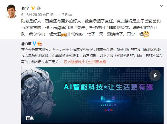 6月9日消息,愛奇藝創(chuàng)始人、CEO龔宇在微博上回應(yīng)了2017愛奇藝世界大會開幕式主題演講中陸奇的“PPT烏龍事件”,稱百度獨自承擔了責任,而這個錯誤是因為愛奇藝和百度雙方溝通出現(xiàn)失誤。龔宇將陸奇稱之為“好人”,并表示因為失誤和回應(yīng)晚了,要請陸奇和他的團隊兩頓大酒。