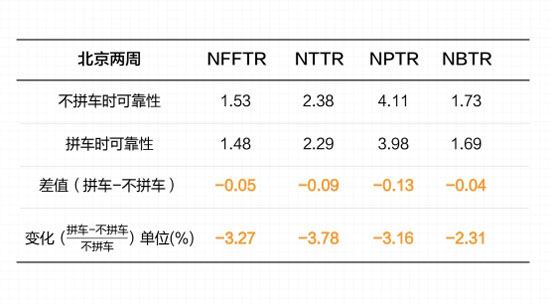 通過對(duì)比隨機(jī)兩周內(nèi)有拼車和無拼車情況下的北京交通可靠性指標(biāo),報(bào)告發(fā)現(xiàn)拼車可以讓NPTR(網(wǎng)絡(luò)規(guī)劃行程時(shí)間率)值減少0.13,NBTR(網(wǎng)絡(luò)緩沖行程時(shí)間率)值減少0.04。前者意味著在擁堵時(shí)拼車讓北京居民平均每千米節(jié)省7.8秒,后者則意味著,拼車讓北京居民平均每千米可以少預(yù)留2.4秒的出行時(shí)間。