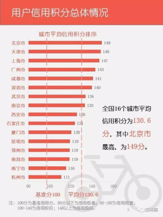基于摩拜健全的信用分體系及海量信用大數(shù)據(jù),《報(bào)告》以北京、上海、天津、武漢、廣州、深圳等16個(gè)城市為樣本,對(duì)共享單車(chē)用戶信用現(xiàn)狀、信用分增長(zhǎng)特點(diǎn)、城市信用體系建設(shè)情況等分析研究。研究發(fā)現(xiàn),全國(guó)16個(gè)城市平均信用分為130.6,北京、天津、上海分別以149、148、147的高分位居前三名。文明騎行,規(guī)范停放是獲得信用分最主要的途徑,26歲-35歲的摩拜用戶是文明騎行最活躍的群體,也是最積極上報(bào)車(chē)輛故障的群體,而18歲-35歲的用戶,是最愿意為他人提供停車(chē)幫助的人群。