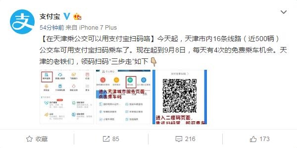 今天起,天津市內(nèi)16條線路(近500輛)公交車可用支付寶掃碼乘車了,F(xiàn)在起到9月8日,每天有4次的免費(fèi)乘車機(jī)會(huì)。