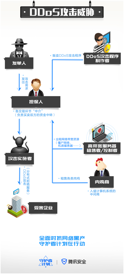 在DDoS攻擊黑色產(chǎn)業(yè)鏈中,鏈條頂端角色為“發(fā)單人”,即出資并發(fā)出攻擊需求的人,一般是出于打壓競爭對手需要而雇傭黑客對其他同類網(wǎng)站進行攻擊。接到指令并執(zhí)行攻擊的人,稱為“攻擊實施人”,他們當中,有的不懂DDoS攻擊服務器搭建,于是從“肉雞商”和“高帶寬服務器租售者/控制者”手中購買!叭怆u商”是侵入計算機信息系統(tǒng)的實施人,他們利用后門程序獲得個人計算機和服務器的控制權限,植入木馬,使得這些計算機變成能實施DDoS攻擊的“肉雞”!案邘挿⻊掌髯馐壅/控制者”是擁有服務器控制權限和網(wǎng)絡流量的人,他們有一定技術能力,能夠租用專屬服務器并自行配置攻擊軟件從而獲取流量。