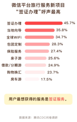 《報(bào)告》數(shù)據(jù)顯示,除了標(biāo)準(zhǔn)化程度較高的交通票務(wù)、住宿等旅行產(chǎn)品外,用戶還希望微信平臺(tái)(錢包)能夠新增簽證辦理、當(dāng)?shù)叵驅(qū)、全球WiFi、包團(tuán)定制、保險(xiǎn)、親子游、分期游、購(gòu)物換匯、房車游等旅行服務(wù)(產(chǎn)品)。這表明,微信用戶希望在微信平臺(tái)上獲得更加豐富的旅行服務(wù)(產(chǎn)品)。