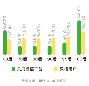 鑒于微信平臺(tái)和旅游APP作為旅游產(chǎn)品購(gòu)買渠道各有優(yōu)劣,有相當(dāng)一部分用戶選擇了兩個(gè)平臺(tái)都使用的策略!秷(bào)告》數(shù)據(jù)顯示,16.7%的受訪用戶屬于“雙棲用戶”,即微信平臺(tái)和旅游APP都使用過(guò)。交叉分析顯示,微信平臺(tái)用戶中有56.8%同時(shí)會(huì)使用旅游APP,旅游APP用戶中有19%會(huì)同時(shí)使用微信平臺(tái)。從用戶年齡層來(lái)看,“00后”群體只用微信平臺(tái)的比例相對(duì)最高,達(dá)到了38.2%。