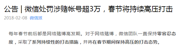 日前,微信派公布了春節(jié)期間對(duì)于涉嫌網(wǎng)絡(luò)賭博的處罰公告——《公告 | 微信處罰涉賭帳號(hào)超3萬(wàn),春節(jié)將持續(xù)高壓打擊》。