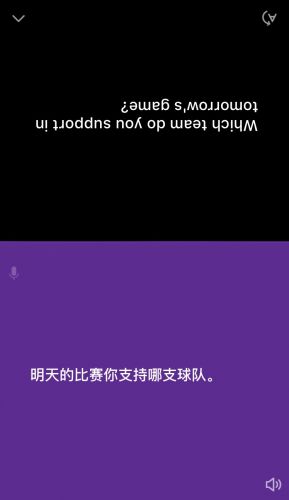 依托堅實的中英翻譯能力,騰訊翻譯君還推出了“同聲傳譯”功能,用戶上拉主頁即可一秒啟動“同傳”界面,體驗精準高效的中英實時翻譯。翻譯界面一分為二,代表不同語言區(qū)域,可直觀呈現翻譯結果,想要切換主體識別語言時,只需點擊語言區(qū)域即可。另外,頂部英文界面還可進行180度翻轉,和外國球迷面對面交流時,對方也可以更直觀地接收訊息,讓翻譯真正“一目了然 ”。