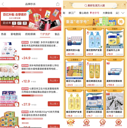活動數(shù)據(jù)顯示,家電數(shù)碼、日化、母嬰類產品擁有最高的達成率:190元的美的電壓力鍋、89元的蘇泊爾煎餅機、54.9元的九陽榨汁機、259.9元的格蘭仕微波爐等家電系列標品,成為截至目前的明星產品。汰漬、多芬、七度空間等個護洗護類高頻消費品,在平均成團時長上占據(jù)明顯優(yōu)勢;“上海老字號品牌特惠專場“則在整體成交轉化率上維持領先。