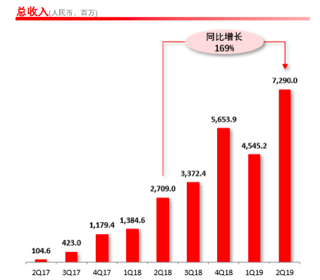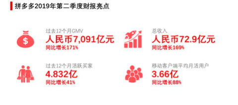 北京時間8月21日,新電商平臺拼多多(NASDAQ:PDD)發(fā)布了2019年第二季度財報。財報顯示,截至2019年6月30日的12個月期間,平臺GMV達7091億元,較去年同期的2621億元同比增長171%;二季度,拼多多實現(xiàn)營收72.90億元,較去年同期的27.09億元同比增長169%,較今年一季度的45.452億元,環(huán)比增長60%。
