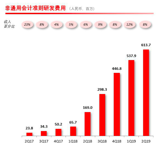 ▲2019年第二季度,拼多多研發(fā)費用攀升至8.037億元,同比增長332%。平臺研發(fā)費用占收入比為11%,高于行業(yè)平均水平。