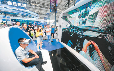 2019中國(guó)國(guó)際智能產(chǎn)業(yè)博覽會(huì)上,在東贏恒康控股集團(tuán)展臺(tái),一名參觀者通過(guò)VR體驗(yàn)無(wú)人駕駛汽車(chē)自動(dòng)入庫(kù)停車(chē)。
