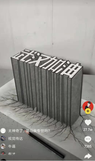 自學(xué)繪畫者“阿升”( ID:shi000666)用一張紙,一支筆,一把尺子,便將“武漢加油”四個(gè)字描摹得立體感十足,如同手工3D打印一般。像一個(gè)建筑一樣高聳矗立著。該條視頻獲得老鐵27.7萬點(diǎn)贊。