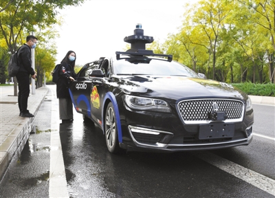 市民在北京市海淀區(qū)稻香湖路的百度自動(dòng)駕駛出租車指定上車點(diǎn)乘車。新華社記者 任超攝