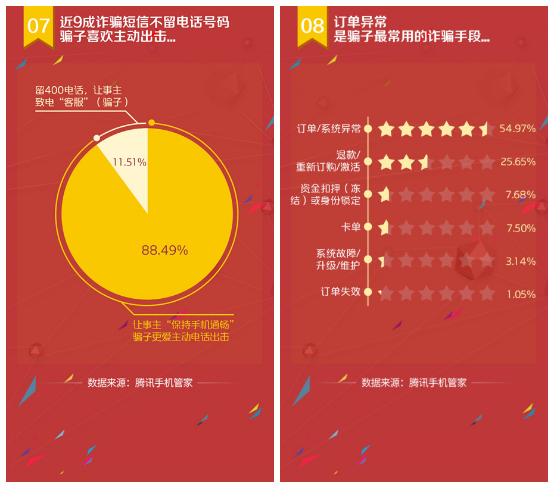 通過騰訊手機(jī)管家近8億用戶舉報的大數(shù)據(jù),發(fā)現(xiàn)有88.49%的詐騙短信不會留聯(lián)系方式,而是留下釣魚網(wǎng)址,讓受害人輸入銀行賬號密碼;還有些會留下400電話,讓受害人回?fù)芎笤龠M(jìn)行詐騙。
